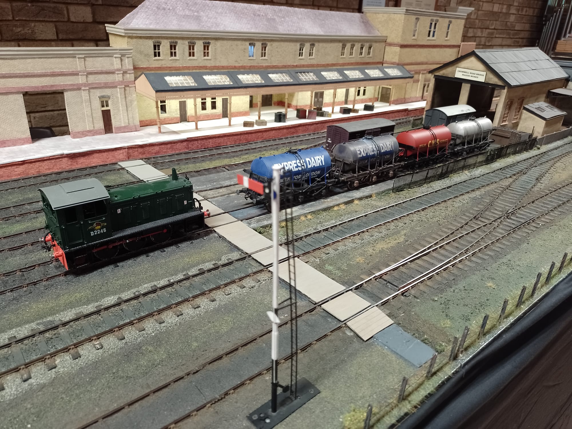 From left to right there is a 12ft fiddle yard including a sector plate and traverer/turntable with storage for 4 trains and numerous locos. This feeds into the goods yard with wooden loading plaform, the dairy and to the platform mainly dealing with parcels traffic. To the right of the goods yard are the arches either side of the over brige. Some of the arches are occupied with traders wheras others are boarded up awaiting a new tenant. The truncated lines under the bridge are now used as sidings. At the rear of the signal box is the milk depot which has regular deliveries and collections. A serving shed can be seen in front of the station platform with it’s own paved sidings. This shed caters for wagons and coaches and services the yards own shunters. on the far right is a disused goods platform and with a warehouse frontage bricked up long ago. Behind that is an 8ft fiddle yard which uses cassettes.