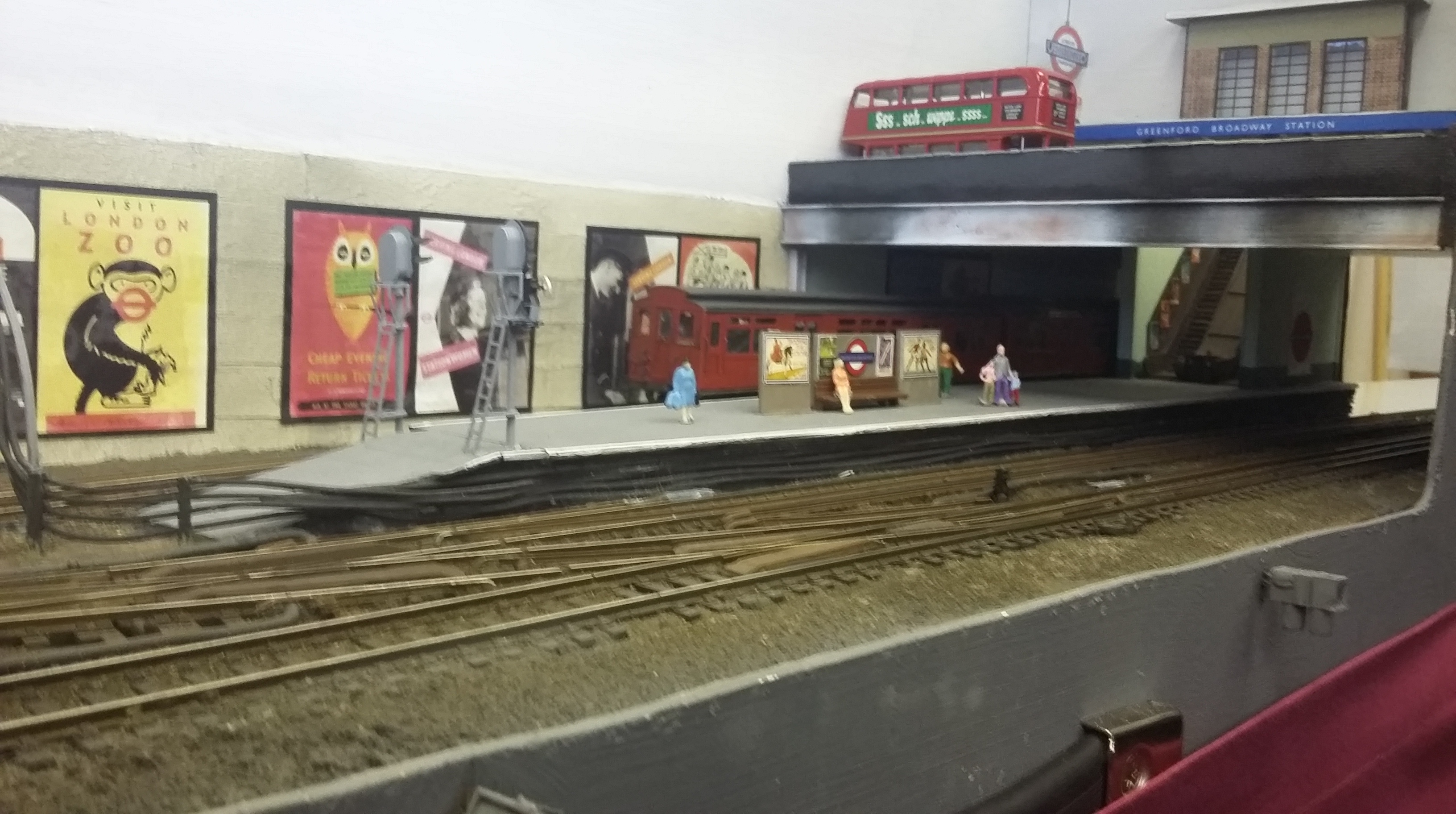Greenford Broadway station is imagined as being situated on the east side of Ravenor Park, alongside Oldfield Lane South which runs behind the concrete wall along the back of the layout. The Charles Holden style ticket hall is on the south side of The Broadway on the B445 Ruislip Road.