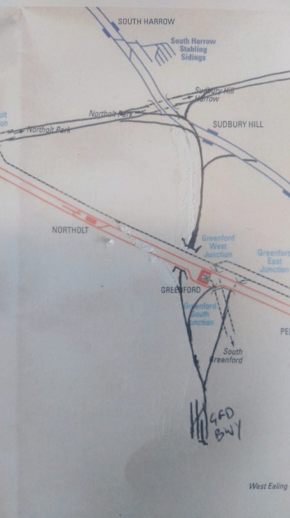 Greenford Broadway is awkwardly served by a single line which, on its way north from Greenford Broadway, fans into a series of single line spurs, all controlled by Greenford Broadway signal cabin (of ‘Farringdon’ style). From east to west the spurs connect to: